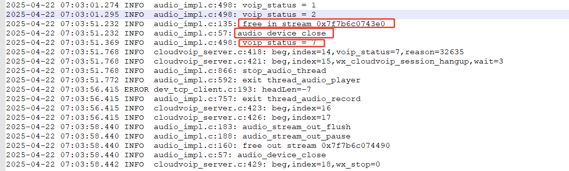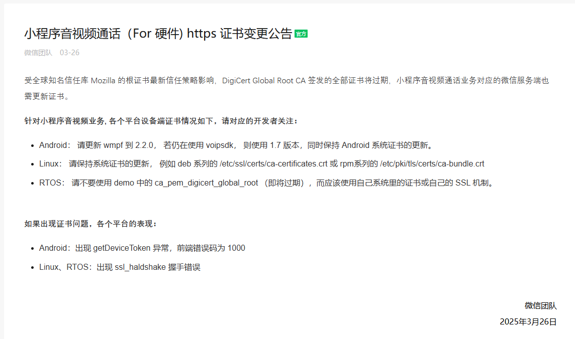高工,没发这个公告之前是没有问题的,通话不断开;发了这个公告后,话机换了证书后,微信小程序给终端打电话,微信sdk通话50秒后,会收到WX_CLOUDVOIP_SESSION_ABORTED = 7, // 发生异常;这个通话状态,麻烦您给分析下怎么回事?