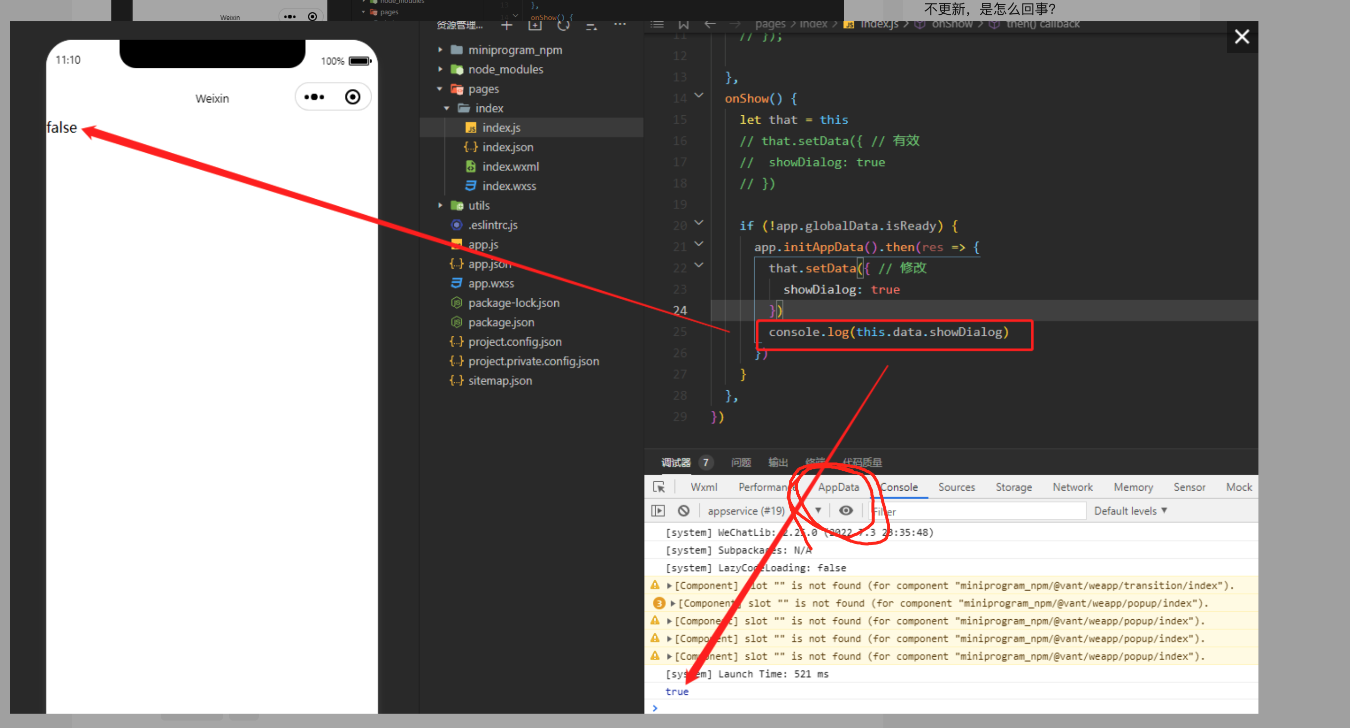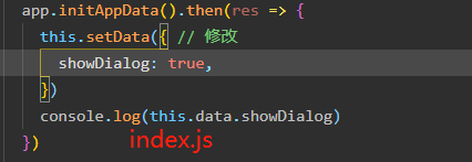 從一開始的if(!app.globalData.isReady)這個開始,我猜測是因為isReady已經是true了,並且showDialog默認為false,所以界面顯示為false,而截圖中的console結果未必是onShow中的執行結果。