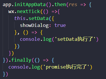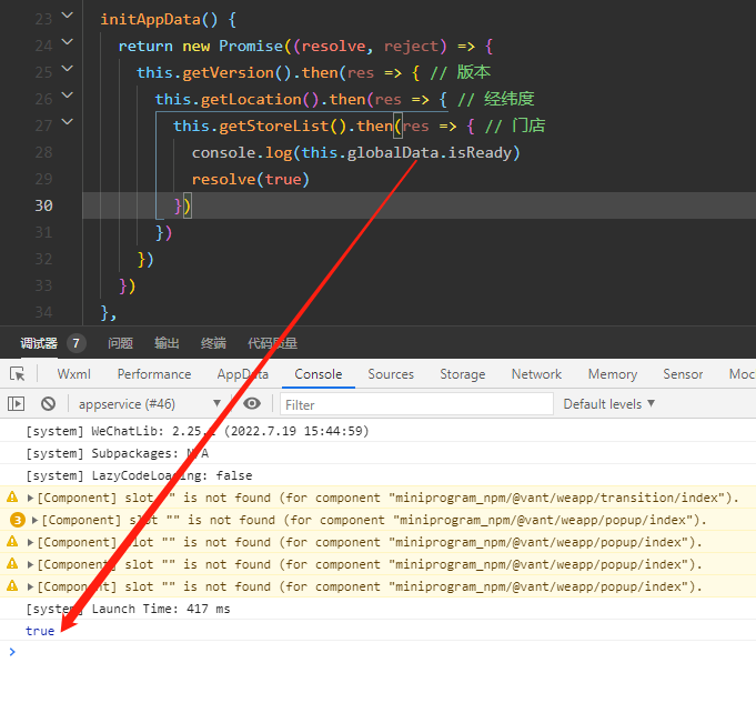 如果打印了initAppData resolve ,則代表你上面的那堆方法都返回了resolve,已經初始化成功了。