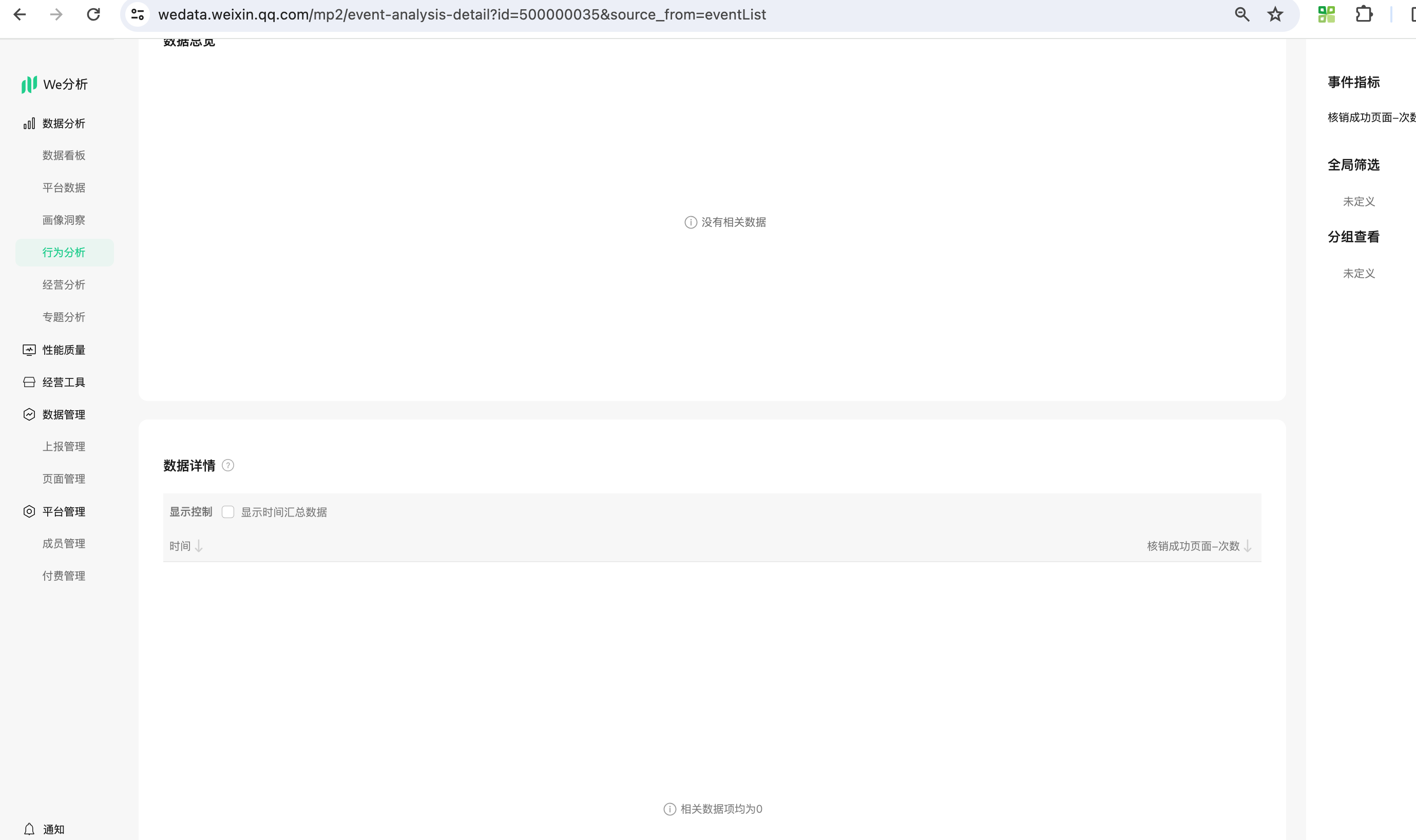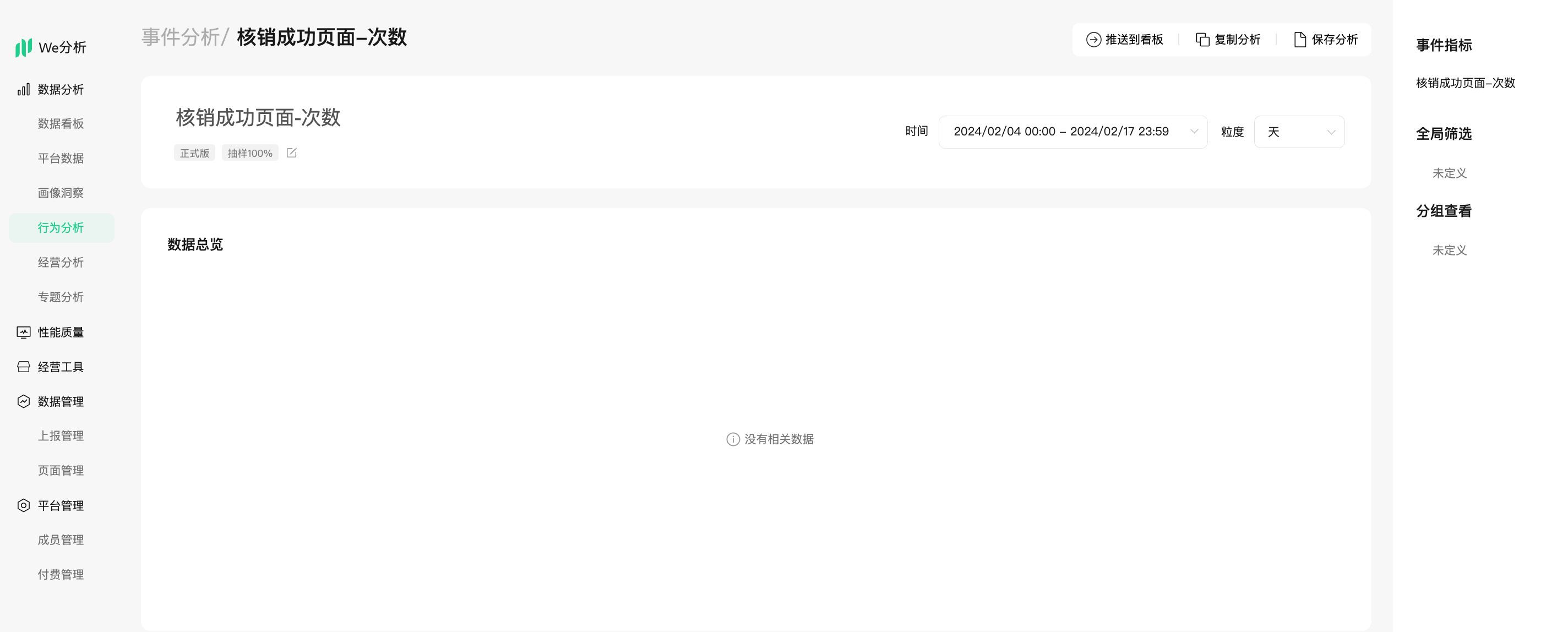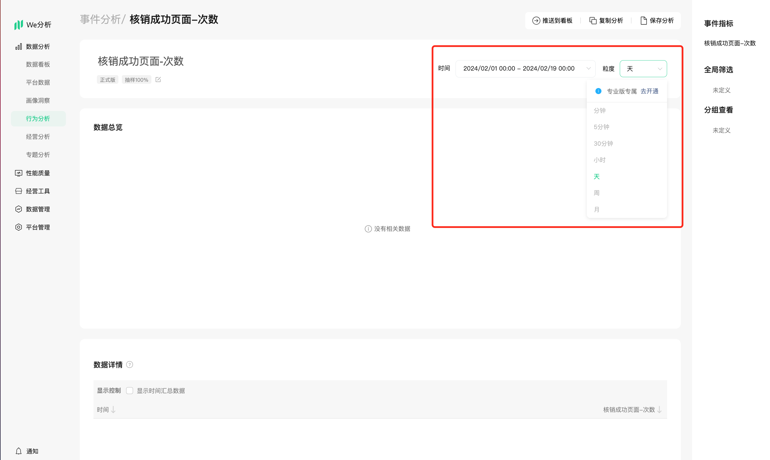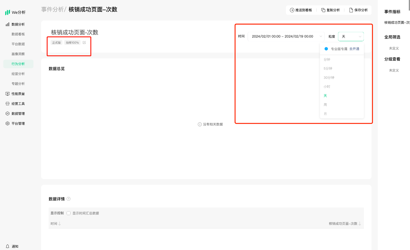 行为分析-事件分析里面创建分析默认都是统计正式版的数据,你可以选择全部查看