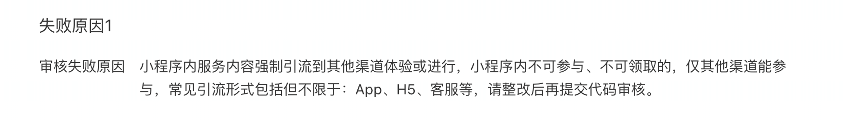 你好,经核实,你的小程序服务内容涉及强制引流到其他渠道体验或进行,小程序内不可参与、不可领取的,仅其他渠道能参与,常见引流形式包括但不限于:App、H5、客服等,请整改后再提交代码审核。后续审核将以实际版本内容为准。