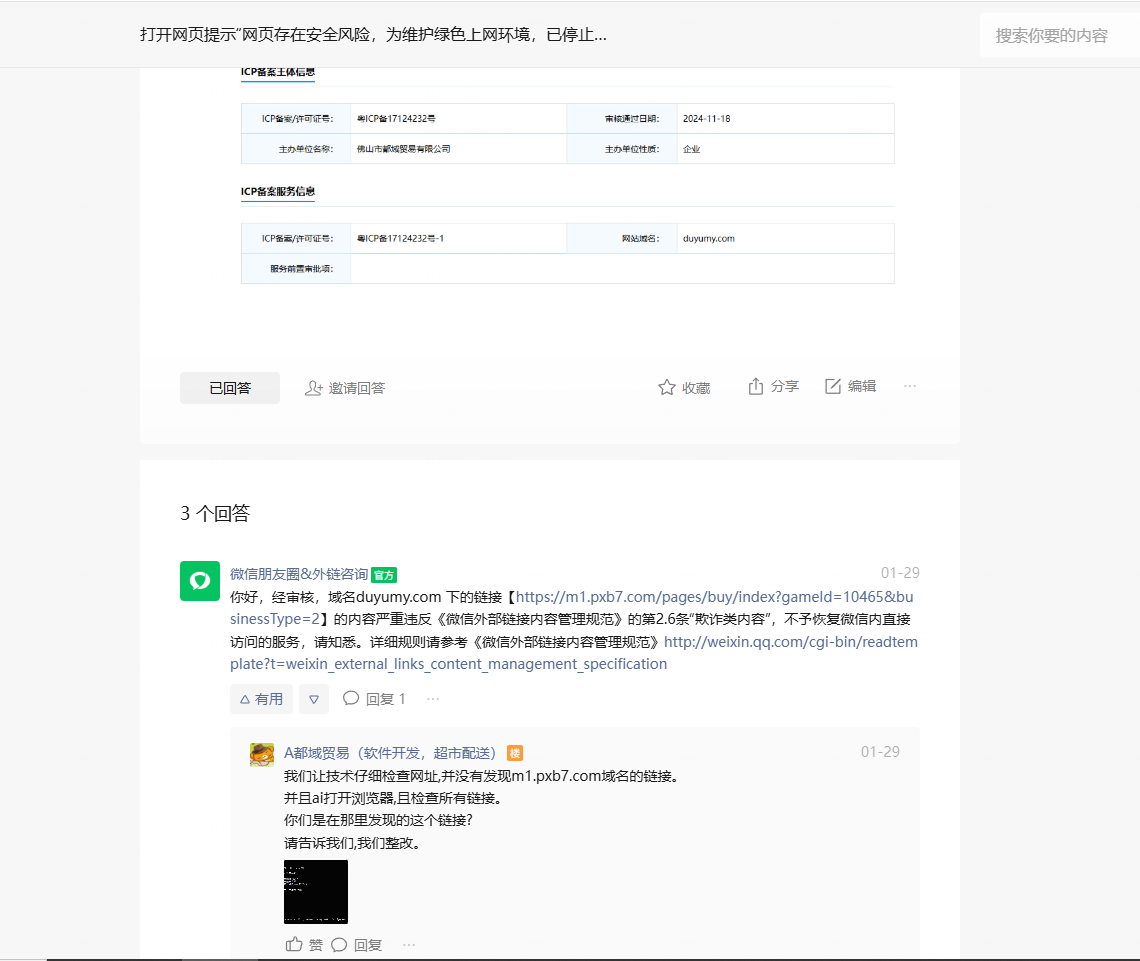 我司主域名 duyumy.com 下的子域名链接近期在微信内访问时,被提示“网页存在安全风险,为维护绿色上网环境,已停止访问”。该情况严重影响了网站的正常访问及用户体验。经我方技术团队全面自查与核实,现将情况说明如下:
