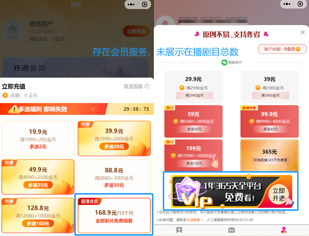 4. 存在会员充值服务的(如包日/月/年、会员全场免费看等)