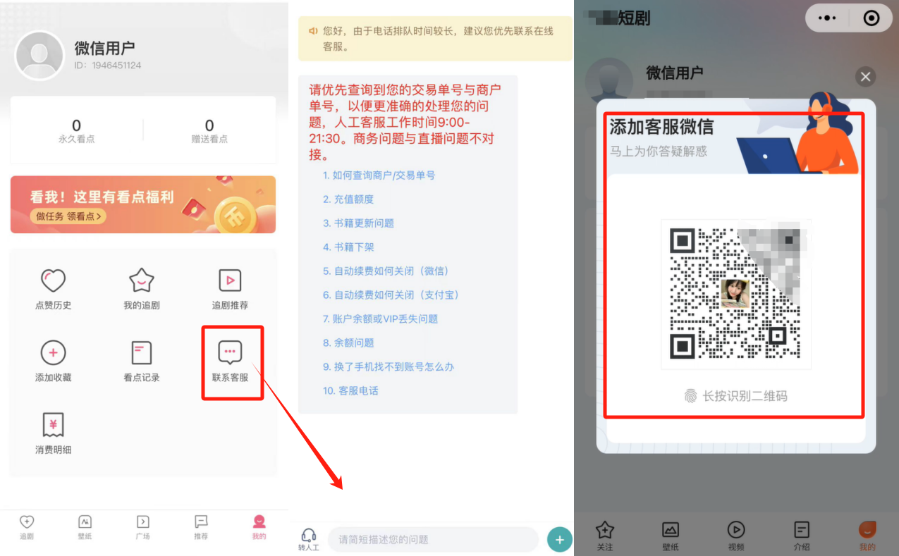 正面案例:设置人工客服入口、客服二维码、联系电话等
