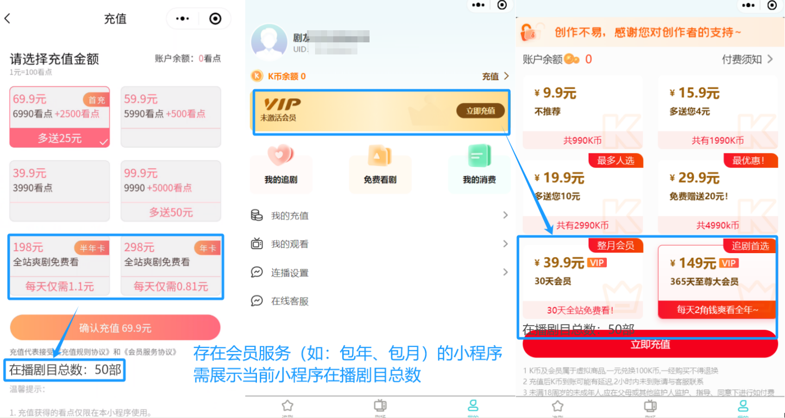 正面案例:在充值中心/会员中心等,明确展示小程序当前在播的剧目总数