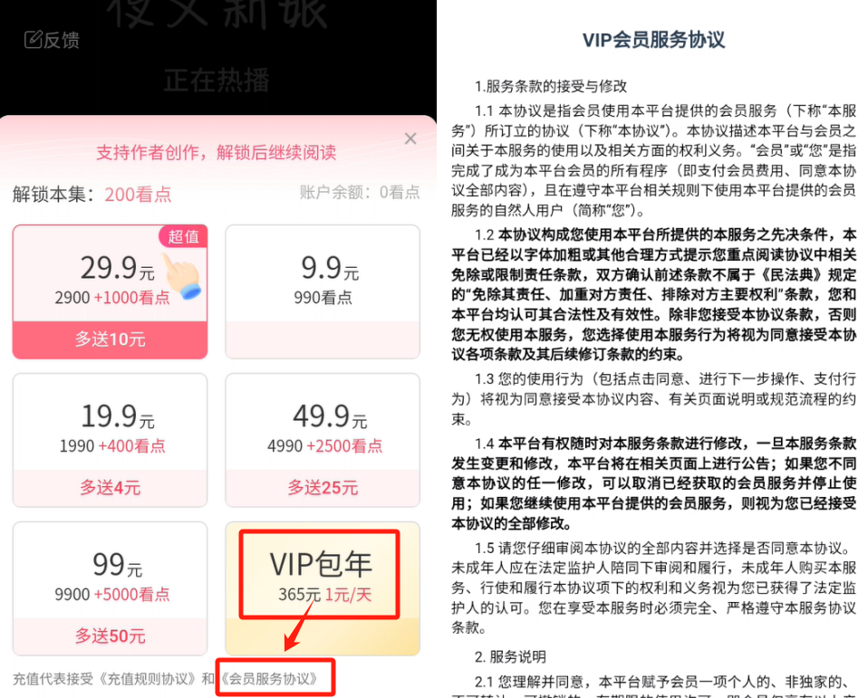 正面案例:存在会员包年服务,提供完整的会员服务协议