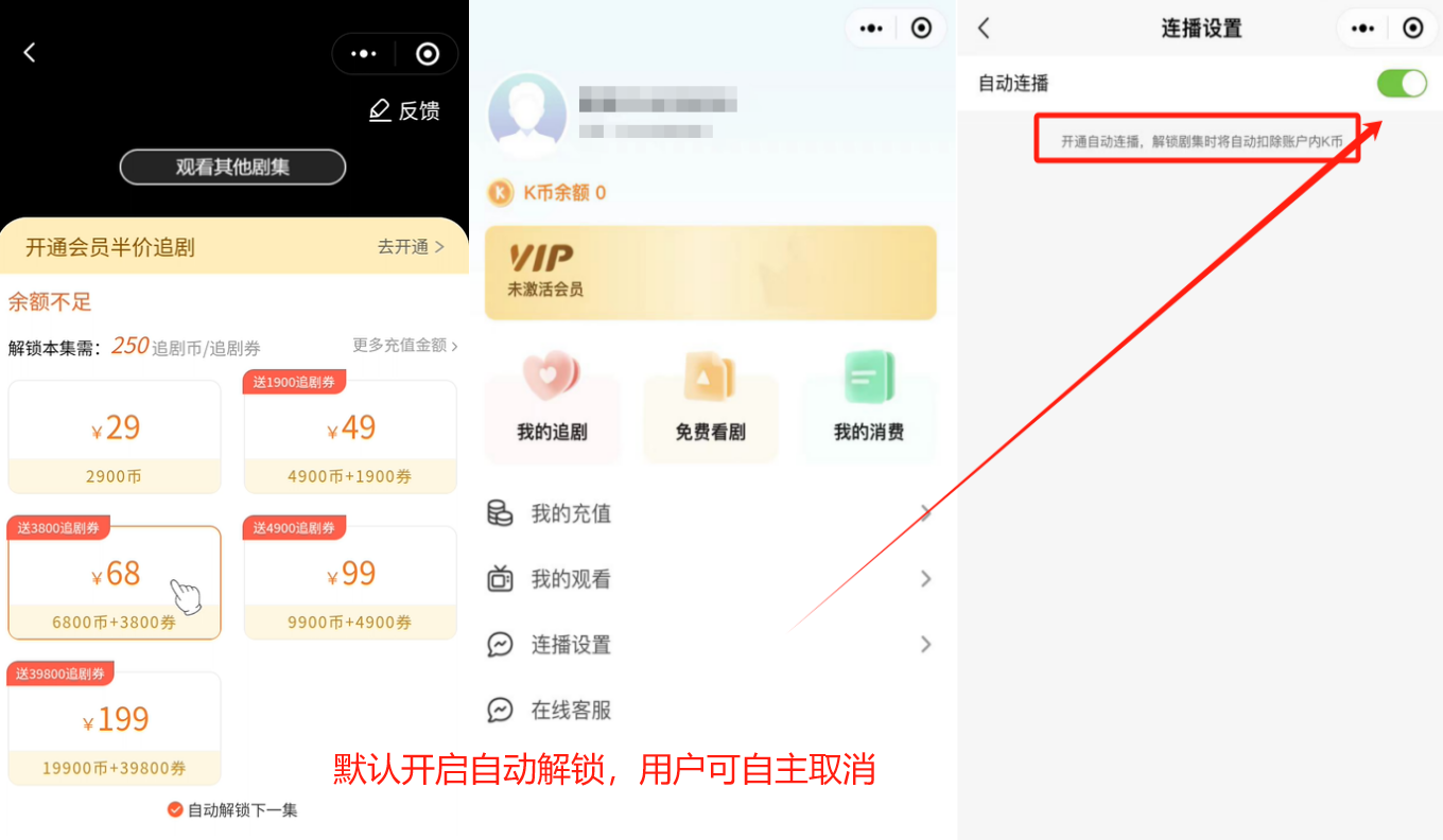 (1)自动解锁下一集、解锁多集、自动连播等功能,需允许用户自主选择取消