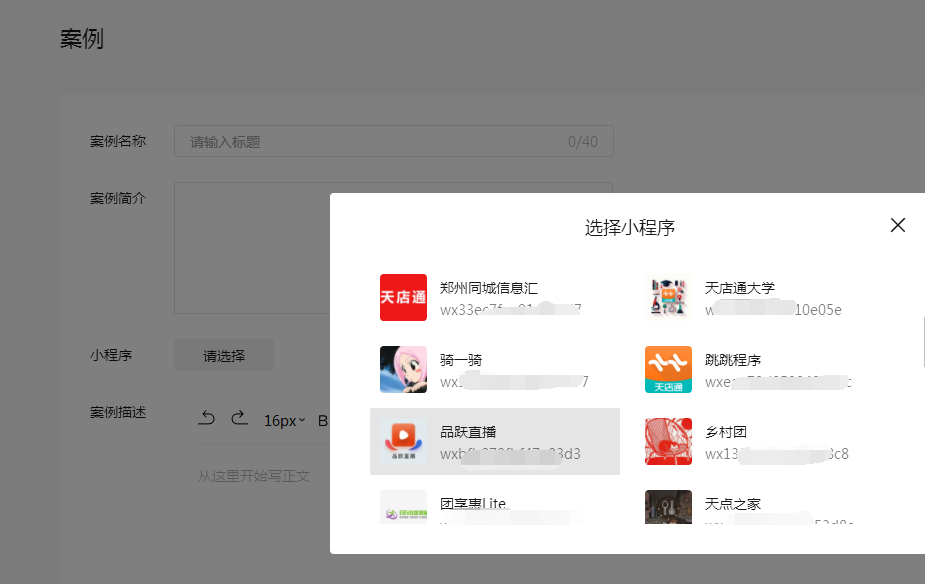 选择小程序时选择不上。使用APPID添加,也不显示下一步。今天下午操作都不行。服务商名字:天店通