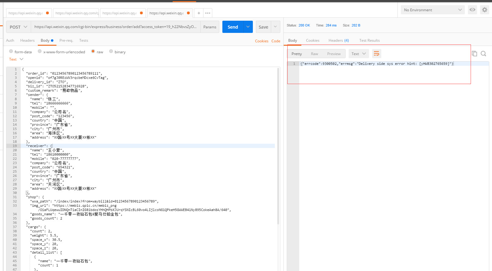 https://api.weixin.qq.com/cgi-bin/express/business/order/add?access_token=ACCESS_TOKEN,后台也配置 了中通账号,但仍然不能调通,麻烦帮忙看下
