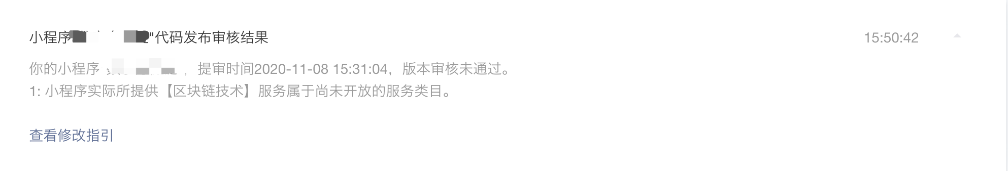 经核实,小程序涉及平台尚未开放的服务类目:区块链技术,需整体均移除上述违规内容后,再提交代码审核。审核将以实际提交的小程序服务内容及类目为准。