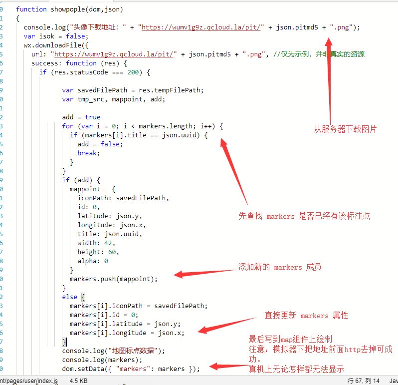 wx.downloadFile({ url: "https://798583668.z-yd.cn/pit/" + json.pitmd5 + ".png", //仅为示例,并非真实的资源 success: function (res) { if (res.statusCode === 200) { var savedFilePath = res.tempFilePath; var tmp_src, mappoint, add; add = true for (var i = 0; i < markers.length; i++) { if (markers[i].title == json.uuid) { add = false; break; } } if (add) { mappoint = { iconPath: savedFilePath, id: 0, latitude: json.y, longitude: json.x, title: json.uuid, width: 42, height: 60, alpha: 0 } markers.push(mappoint); } else { markers[i].iconPath = savedFilePath; markers[i].id = 0; markers[i].latitude = json.y; markers[i].longitude = json.x; } console.log("地图标点数据"); console.log(markers); dom.setData({ "markers": markers }); |