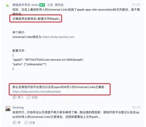 如果使用微信的这个域名是可以看到拉起app的入口的,但使用我自己的域名就看不到拉起app的入口,我的Universal Links配置格式为https://域名/path/,测试的时候为https://域名/path/abc,但是没有显示进入app的入口,在微信开放平台里面Universal Links也是配置的,程序中也注册了对应的Universal Links,Domains里面也配置了applinks:域名,同时URL Type里也做了配置,infoplist的LSApplicationQueriesSchemes也加了weixin和weixinULAPI,还有域名服务器根目录也传了文件并且配置了apple-app-site-association文件内容。但是分享时仍然每次都是跳转两次。麻烦问下是什么原因呢?