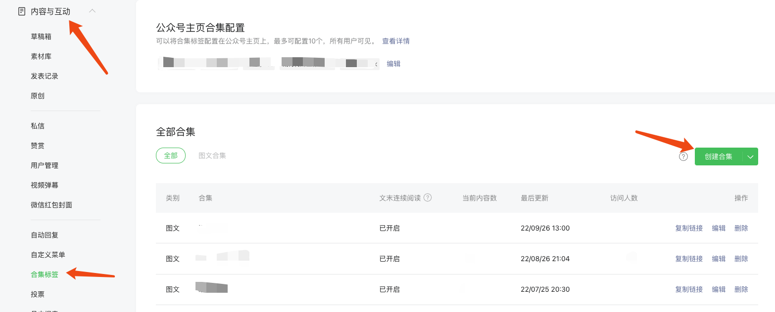 前往公众号后台 -> 内容与互动 -> 合集标签 里面创建。