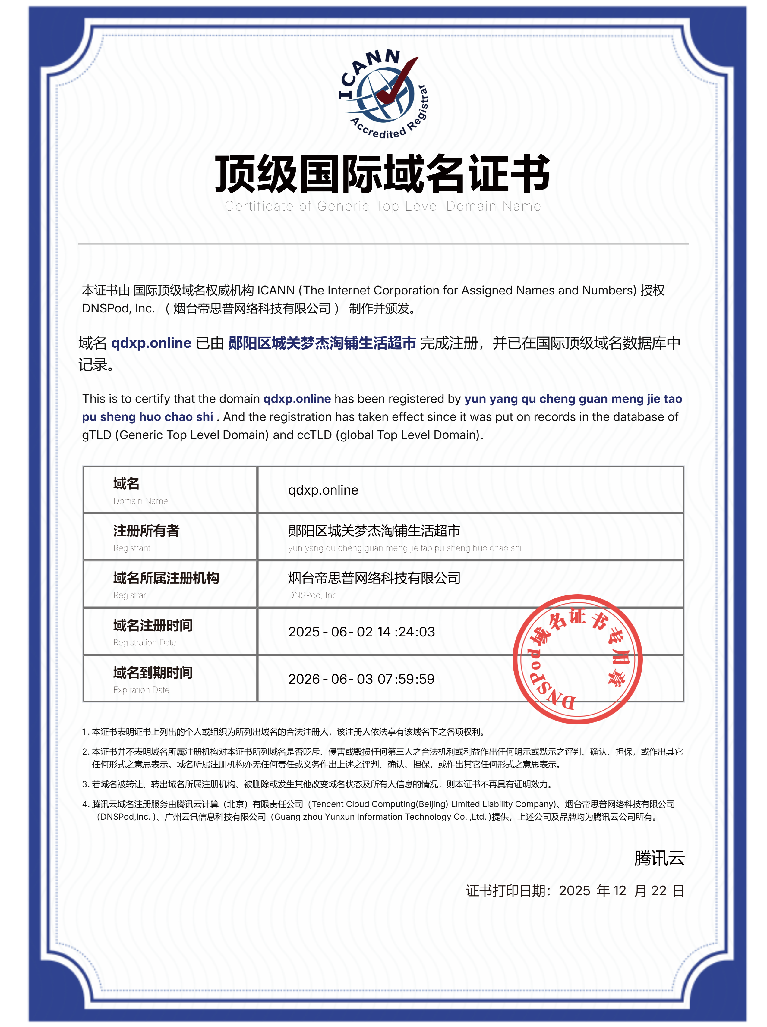 1.域名www.qdxp.online,业务主体: 郧阳区城关镇梦杰淘铺生活超市(域名/公众号/服务号/企业微信/腾讯云账号/微信开发者平台 主体一致)
