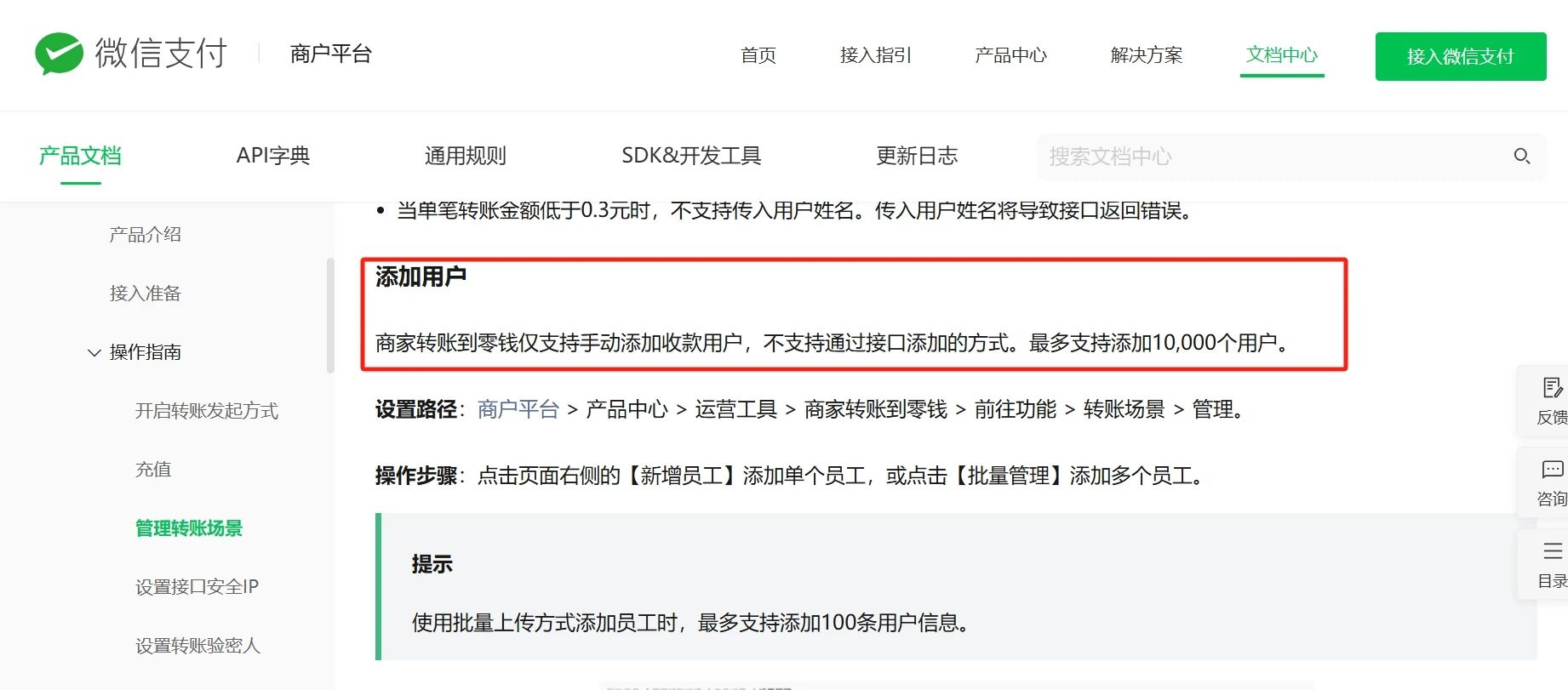 关于商户转账到用户零钱的功能,这句话的意思是,不能直接通过调用api从商家账户上向用户转账,需要再平台上添加该用户的信息,才能调用api转账吗