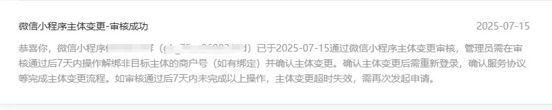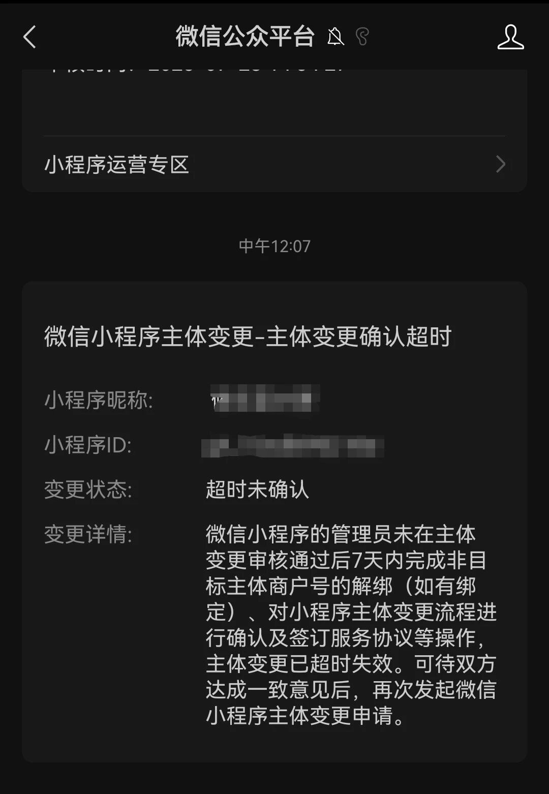 事情经过:名下一个个人小程序要变更为公司,缴费电话审核后,我每天都登录后台看,一直没有提示,导致七天认证失败,随发此问