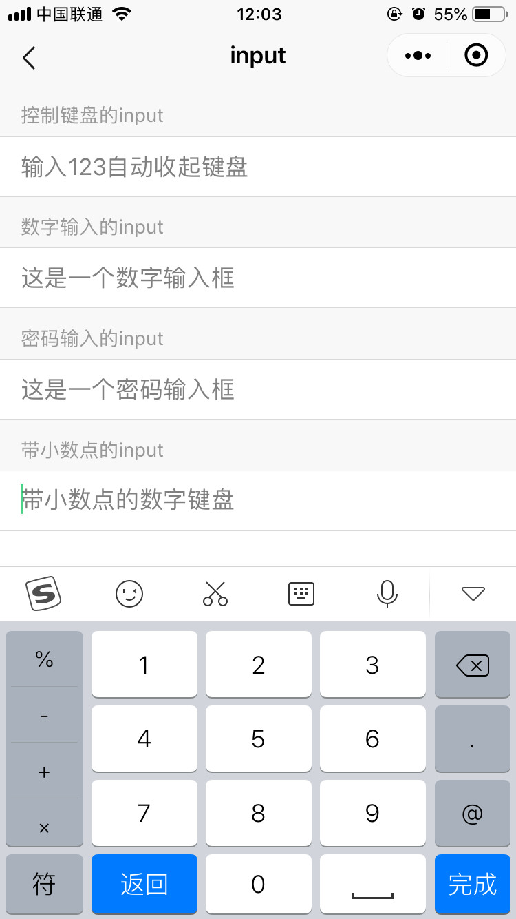 是搜狗键盘,但是我试了同事的iPhone,他也安装的有搜狗输入法,微信7.0.4,数字input并不会调起搜狗输入法。正常来说,数字input应该始终调起的是小程序自带的数字键盘