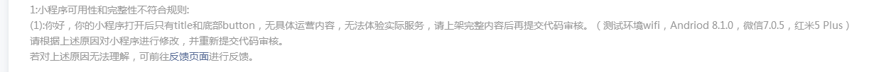 你好,经核实,贵方小程序进入会自动定位审核人员当前位置,打开后只有title和底部button,无具体运营内容,无法体验实际服务,建议在版本描述中写明已上架正式内容的城市或相关地址,以便审核人员审核。(详图如下)