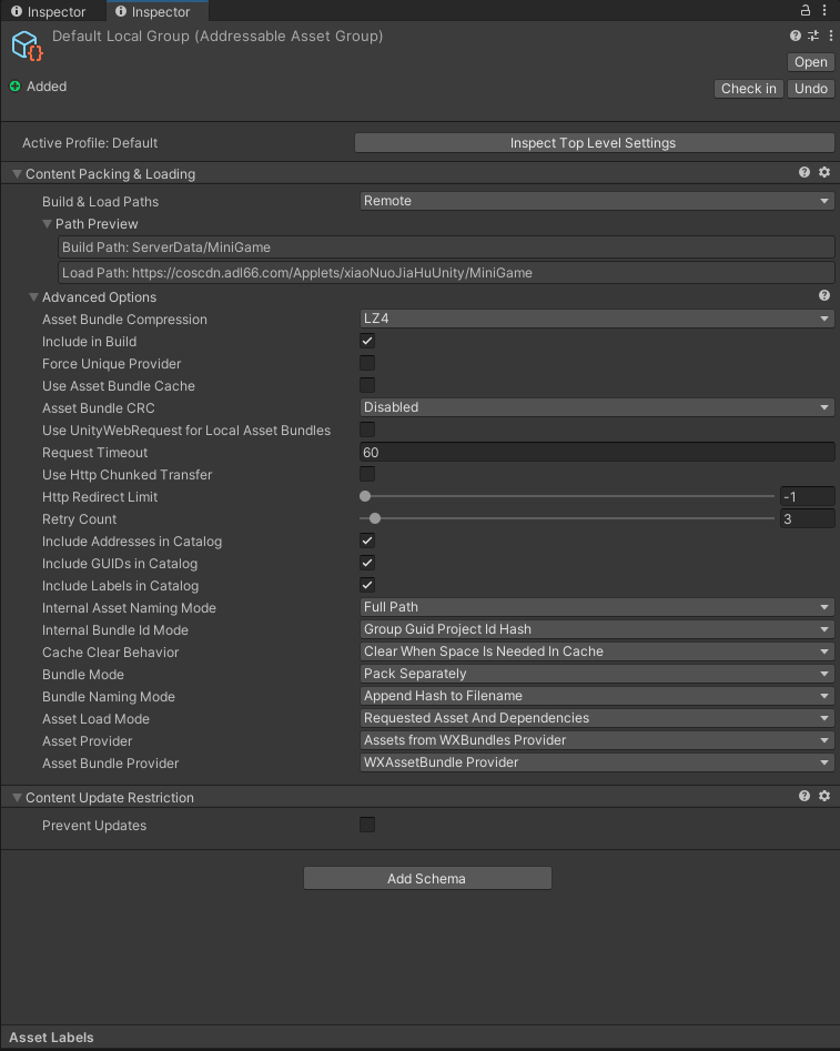 然后自己又照着微信的gitee案例教程步骤调整了一下导入了一下runtime那个代码,修改default local group 配置如图(使用Assets from WXBundles 的加载资源方式等)之后就没有加载成功了,偶尔还会报错找不到资源404。大家都用小游戏aa包加载吗?跪求求大佬解决