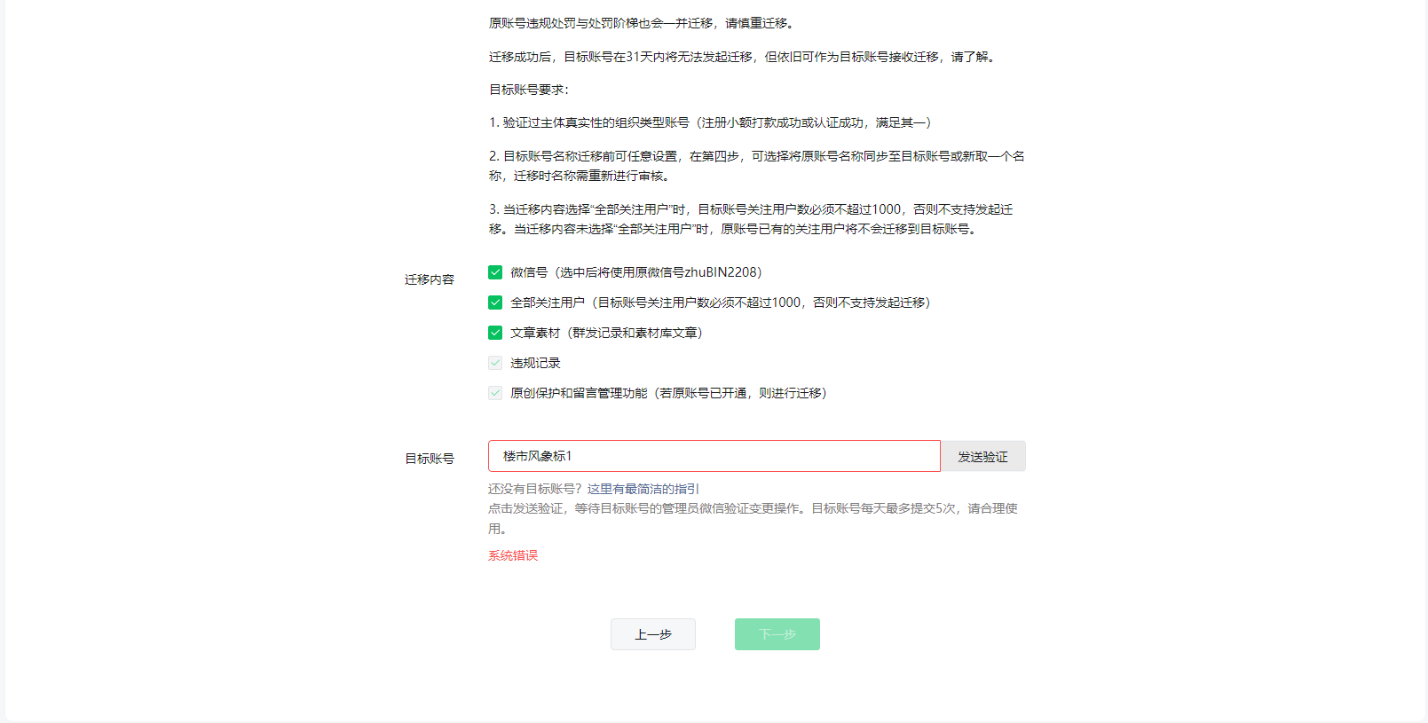 昨天申请的公众号迁移,在上传申请函的过程中退出了页面,重现进入后又要重新走流程,到发送验证的这一步玖卡死在“系统错误”这里,一直找不到人工客服,请求速度解决!!!!