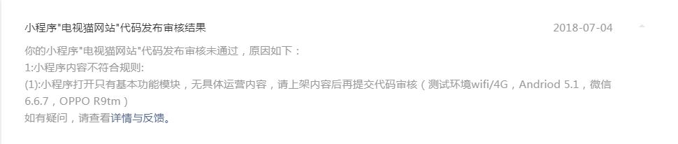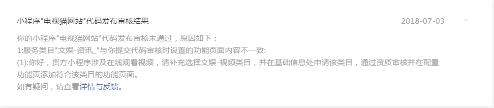 电视猫小程序内容不涉及视频,应该是贵司审核同学误看以为有视频。