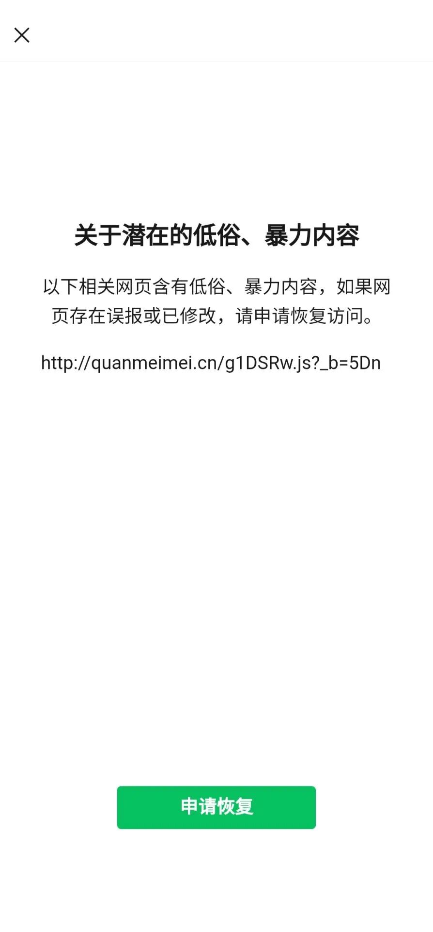 你好,经核实,域名quanmeimei.cn 下的链接【http://quanmeimei.cn/g1DSRw.js?_b=5Dn】的违规内容已经修改,现已恢复微信内直接访问的服务,请知悉。