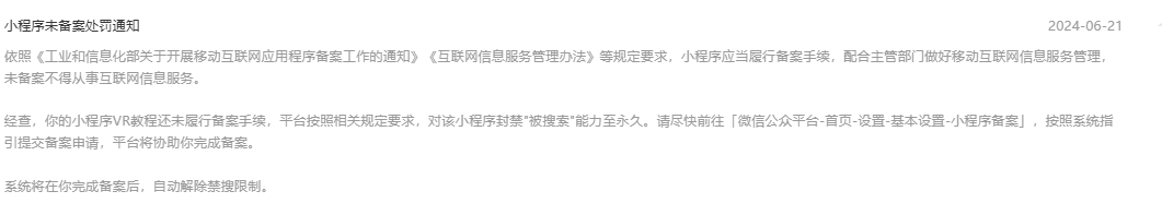 之前未备案被封禁,现在已经完成备案成功了,依然没有自动解除禁搜限制