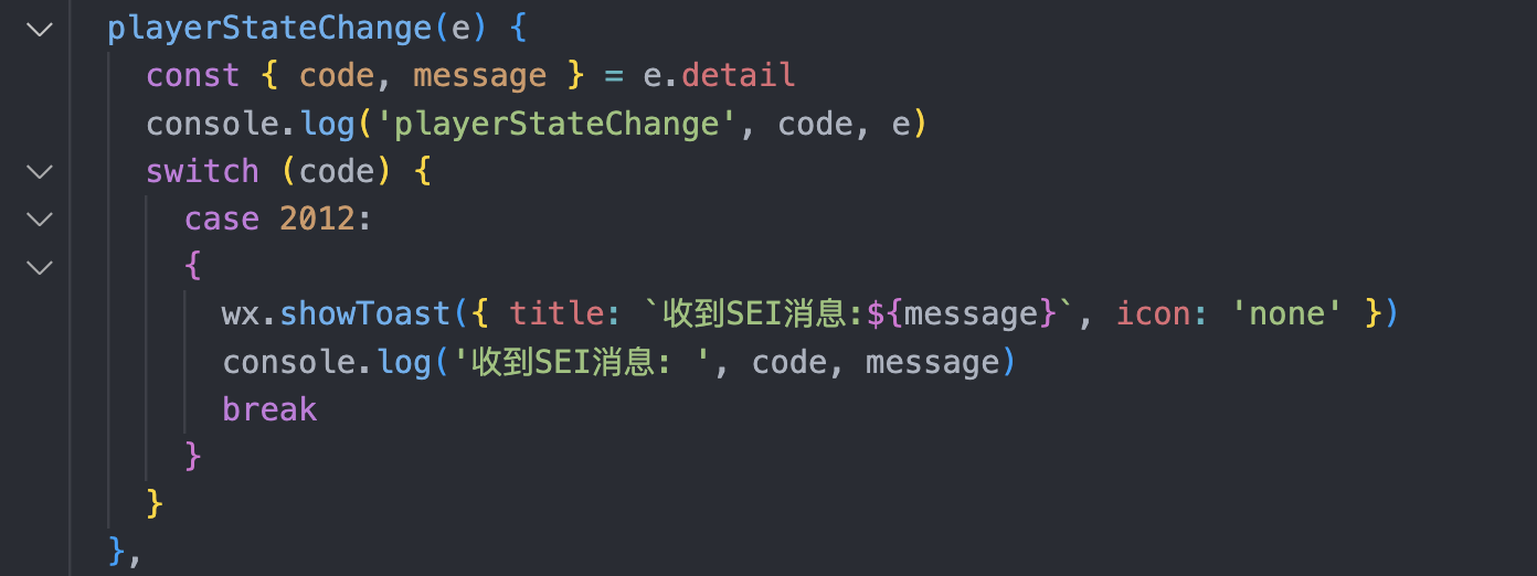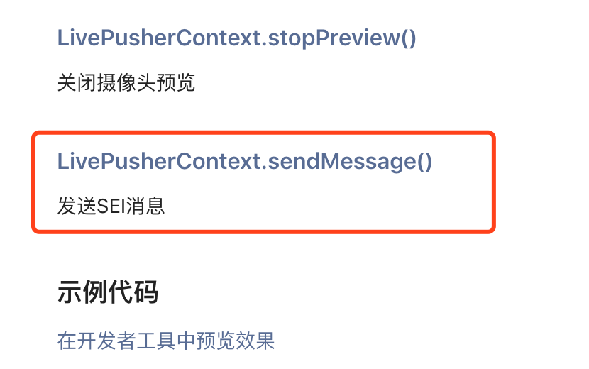 可以参照 微信小程序 API LivePusherContext.sendMessage 进行 SEI 发送,通过监听 [live-player] bindstatechange 2012 事件进行接收,代码参考如下: