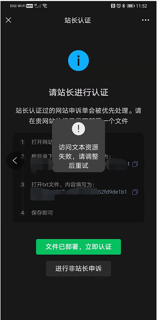 按微信要求在网站上传了指定的站长验证文件,但微信提示“访问文本资源失败,请调整后重试”,多次上传,同时通过浏览器也可以访问到验证文件了,但微信端内仍然有这个提示,见以下截图