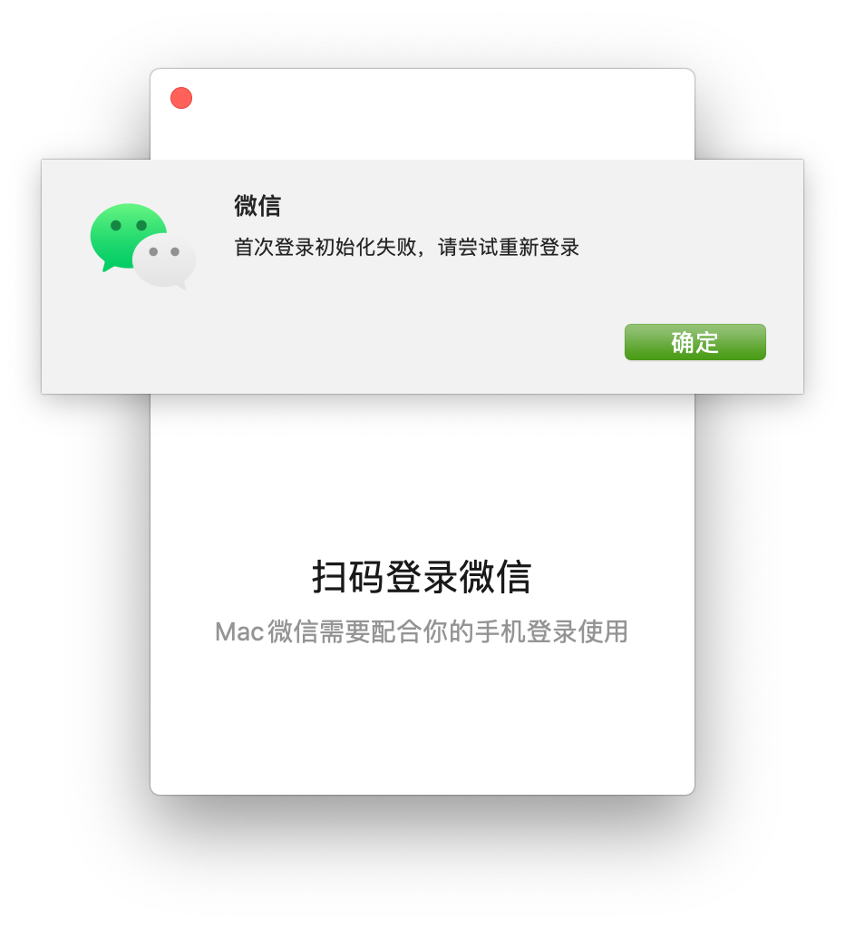 iOS微信扫码之后显示正在登录,iOS的微信显示Mac微信已登录,Mac微信显示“首次登录初始化失败,请尝试重新登录”,反复尝试还是出现