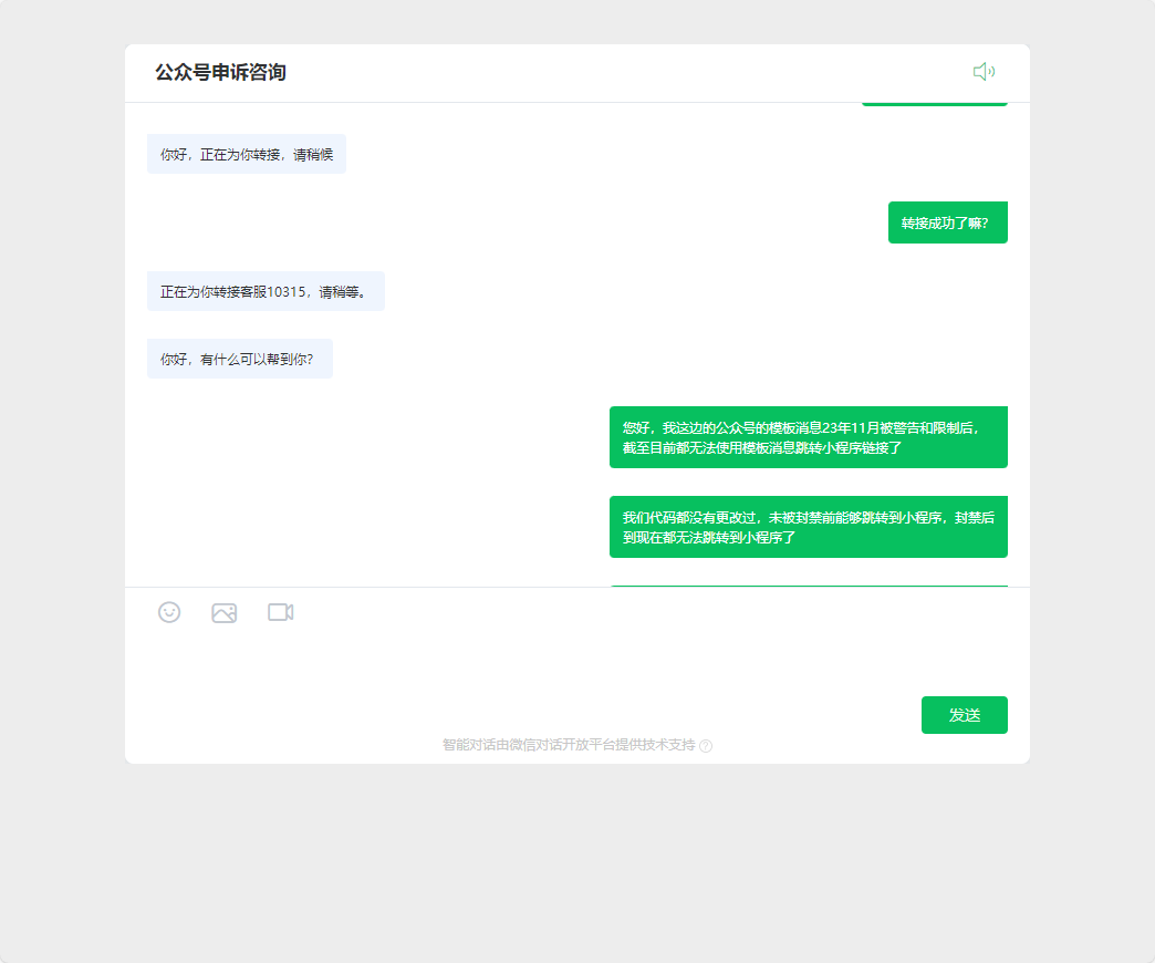 且我们用同样的代码使用了测试公众号(APPID:wx29415e31ee941c85)是能够跳转到小程序,故而目前测试推论是我们的公众号跳转小程序的功能仍然被官方禁止中。