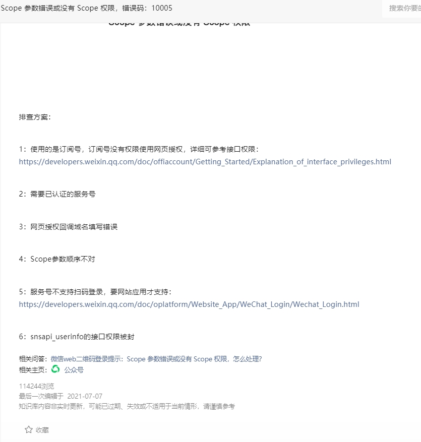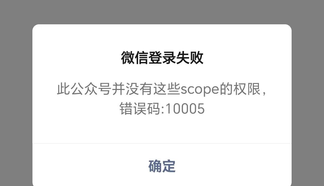 公众号自定义菜单栏设置了2个链接跳转,提示Scope 参数错误或没有 Scope 权限,错误码:10005