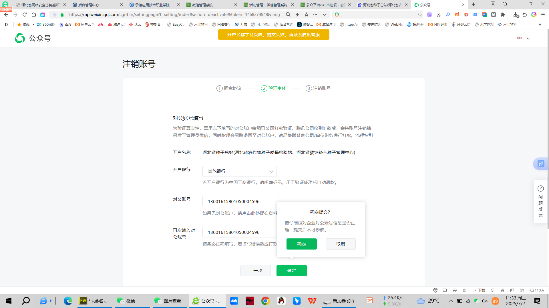 注销公众号,提示:“开户名称字符受限,提交失败,请联系腾讯客服”,我该怎么办啊?