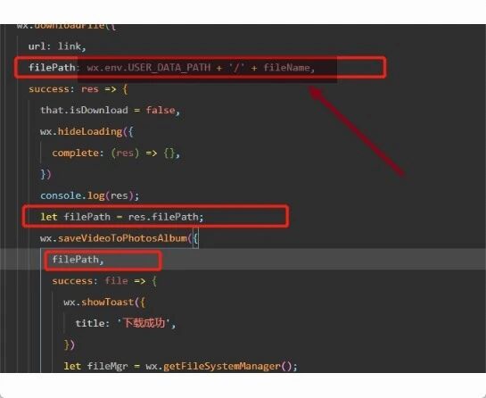 onSaveClick:function(){ var that = this; wx.showLoading({ title: '下载中...', }) var filename = new Date().getTime()+".jpg"; var savePath = wx.env.USER_DATA_PATH+"/"+filename wx.downloadFile({ header:'content-type: image/jpg', url: that.data.img, filePath:savePath, success:function(res){ wx.hideLoading({ success: (res) => {}, }) var filePath = res.filePath that.setData({filePath:filePath}) wx.getSetting({ success: (res) => { console.log('getSetting', res); var writePhotosAlbum = res.authSetting['scope.writePhotosAlbum']; if (writePhotosAlbum == true) { that.saveImg() }else if(writePhotosAlbum==false){ wx.showModal({ title: '是否授权保存到相册', content: '需要获取您的保存图片权限,请确认授权,否则图片将无法保存到相册', success: function (tip) { if (tip.confirm) { wx.openSetting({ success: function (data) { if (data.authSetting["scope.writePhotosAlbum"] === true) { that.saveImg() } else { wx.showToast({ title: '授权失败', }) } } }) } } }) }else{ that.saveImg() } }, fail: function(res) {}, complete: () => {} }) } }) }, saveImg:function(){ var filePath = this.data.filePath wx.showLoading({ title: '保存中...', }) wx.saveImageToPhotosAlbum({ filePath: filePath, success: function (res) { wx.hideLoading({ success: (res) => {}, }) wx.showToast({ title: '保存成功', icon: 'success', duration: 1500, }) }, fail: function (res) { wx.showToast({ title: "保存失败:"+res.errMsg, icon: 'none', duration: 1500, }) }, complete: function (res) { }, }) },注意上方代码,filePath设置前后不一致。