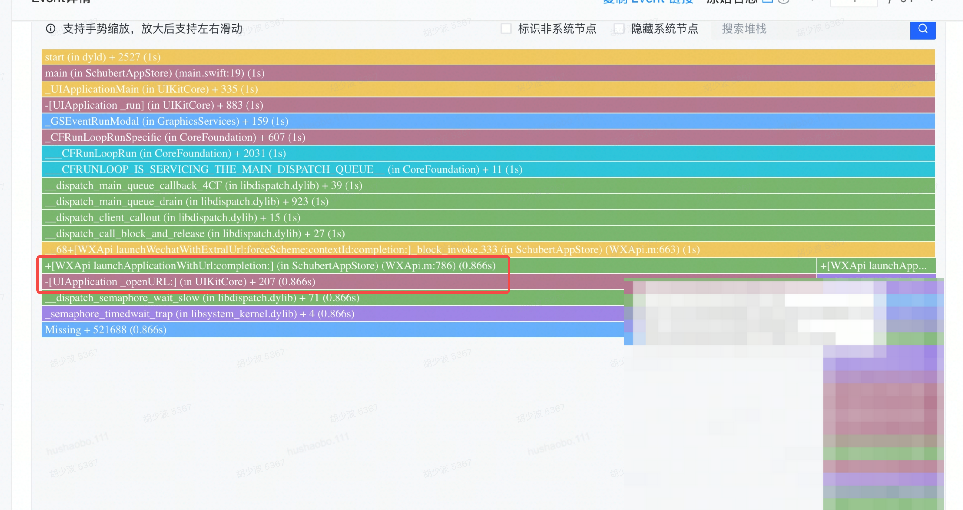 // remark Application main thread deadlocked // 卡死线程 Thread 0 Deadlock: 0 libsystem_kernel.dylib _mach_msg2_trap 1 libsystem_kernel.dylib _mach_msg2_internal 2 libsystem_kernel.dylib _mach_msg_overwrite 3 libsystem_kernel.dylib _mach_msg 4 libdispatch.dylib __dispatch_mach_send_and_wait_for_reply 5 libdispatch.dylib _dispatch_mach_send_with_result_and_wait_for_reply 6 libxpc.dylib _xpc_connection_send_message_with_reply_sync 7 Foundation ___NSXPCCONNECTION_IS_WAITING_FOR_A_SYNCHRONOUS_REPLY__ 8 Foundation -[NSXPCConnection _sendInvocation:orArguments:count:methodSignature:selector:withProxy:] 9 Foundation -[NSXPCConnection _sendSelector:withProxy:arg1:arg2:arg3:arg4:] 10 Foundation __NSXPCDistantObjectSimpleMessageSend4 11 CoreServices -[LSApplicationWorkspace commonClientOpenURL:options:configuration:synchronous:completionHandler:] 12 CoreServices -[LSApplicationWorkspace openURL:configuration:error:] 13 UIKitCore -[UIApplication _openURL:] 14 xxxxxx +[WXApi launchApplicationWithUrl:completion:] WXApi.m:1077 15 xxxxxx __104+[WXApi launchWechatWithExtralUrl:forceScheme:contextId:paramsDataStr:unnecessaryDataErased:completion:]_block_invoke.418 WXApi.m:935 16 libdispatch.dylib __dispatch_call_block_and_release 17 libdispatch.dylib __dispatch_client_callout 18 libdispatch.dylib __dispatch_main_queue_drain 19 libdispatch.dylib __dispatch_main_queue_callback_4CF 20 CoreFoundation ___CFRUNLOOP_IS_SERVICING_THE_MAIN_DISPATCH_QUEUE__ 21 CoreFoundation ___CFRunLoopRun 22 CoreFoundation _CFRunLoopRunSpecific 23 GraphicsServices _GSEventRunModal 24 UIKitCore -[UIApplication _run] 25 UIKitCore _UIApplicationMain 26 Huolala main main.m:14你好,请在复现问题后在手机微信上传日志: 我->设置->帮助与反馈右上角有个上报日志的入口,提供出现问题的微信号,出现问题的时间点(具体到分钟)