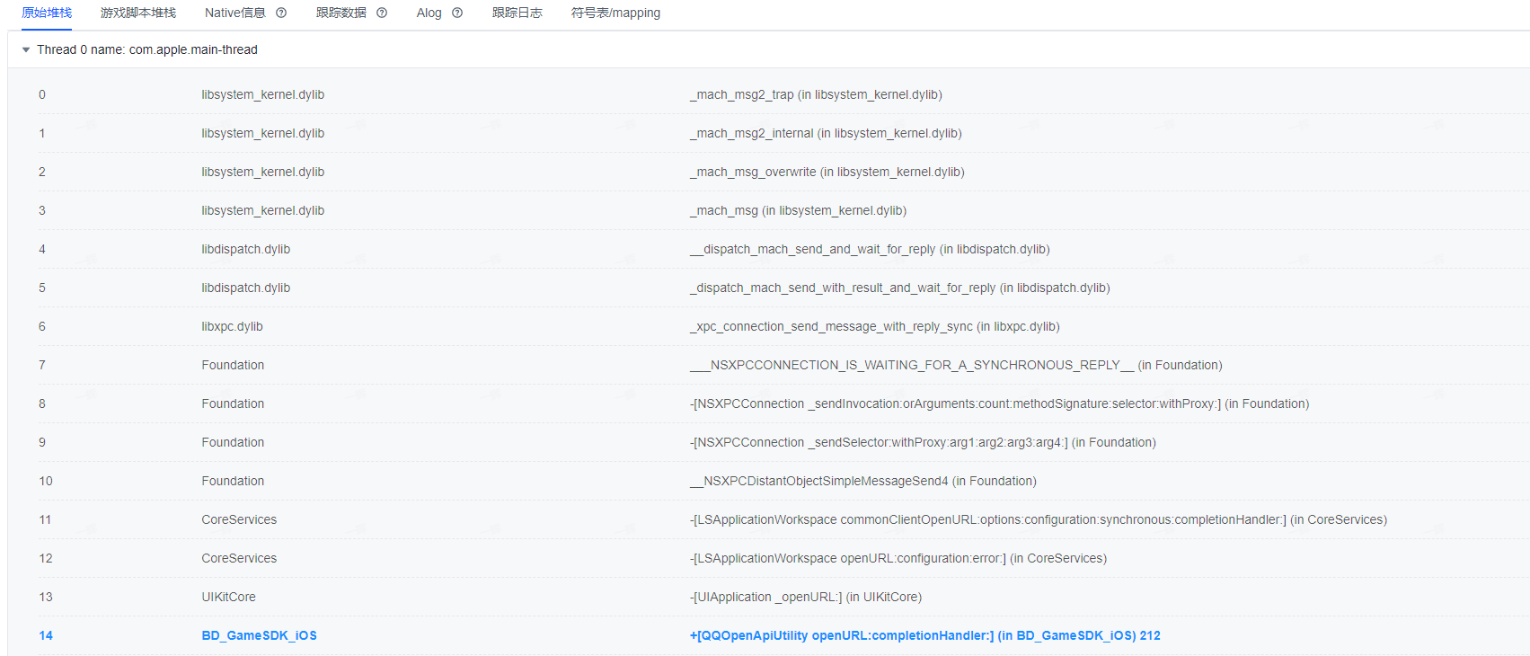 // remark Application main thread deadlocked // 卡死线程 Thread 0 Deadlock: 0 libsystem_kernel.dylib _mach_msg2_trap 1 libsystem_kernel.dylib _mach_msg2_internal 2 libsystem_kernel.dylib _mach_msg_overwrite 3 libsystem_kernel.dylib _mach_msg 4 libdispatch.dylib __dispatch_mach_send_and_wait_for_reply 5 libdispatch.dylib _dispatch_mach_send_with_result_and_wait_for_reply 6 libxpc.dylib _xpc_connection_send_message_with_reply_sync 7 Foundation ___NSXPCCONNECTION_IS_WAITING_FOR_A_SYNCHRONOUS_REPLY__ 8 Foundation -[NSXPCConnection _sendInvocation:orArguments:count:methodSignature:selector:withProxy:] 9 Foundation -[NSXPCConnection _sendSelector:withProxy:arg1:arg2:arg3:arg4:] 10 Foundation __NSXPCDistantObjectSimpleMessageSend4 11 CoreServices -[LSApplicationWorkspace commonClientOpenURL:options:configuration:synchronous:completionHandler:] 12 CoreServices -[LSApplicationWorkspace openURL:configuration:error:] 13 UIKitCore -[UIApplication _openURL:] 14 xxxxxx +[WXApi launchApplicationWithUrl:completion:] WXApi.m:1077 15 xxxxxx __104+[WXApi launchWechatWithExtralUrl:forceScheme:contextId:paramsDataStr:unnecessaryDataErased:completion:]_block_invoke.418 WXApi.m:935 16 libdispatch.dylib __dispatch_call_block_and_release 17 libdispatch.dylib __dispatch_client_callout 18 libdispatch.dylib __dispatch_main_queue_drain 19 libdispatch.dylib __dispatch_main_queue_callback_4CF 20 CoreFoundation ___CFRUNLOOP_IS_SERVICING_THE_MAIN_DISPATCH_QUEUE__ 21 CoreFoundation ___CFRunLoopRun 22 CoreFoundation _CFRunLoopRunSpecific 23 GraphicsServices _GSEventRunModal 24 UIKitCore -[UIApplication _run] 25 UIKitCore _UIApplicationMain 26 Huolala main main.m:14