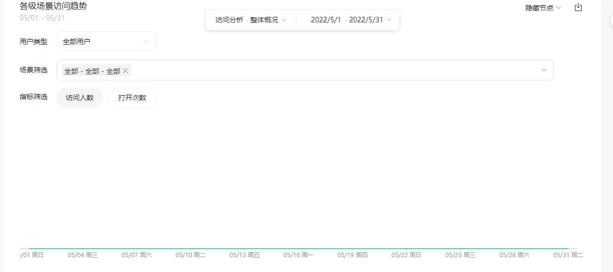 我们做小程序的报告,会用两年的同个月份的数据进行对比。这几天做5月份的数据时,却发现各级场景访问趋势里面,点击查看2022年5月的数据都变成0。7月份以后才有数据。