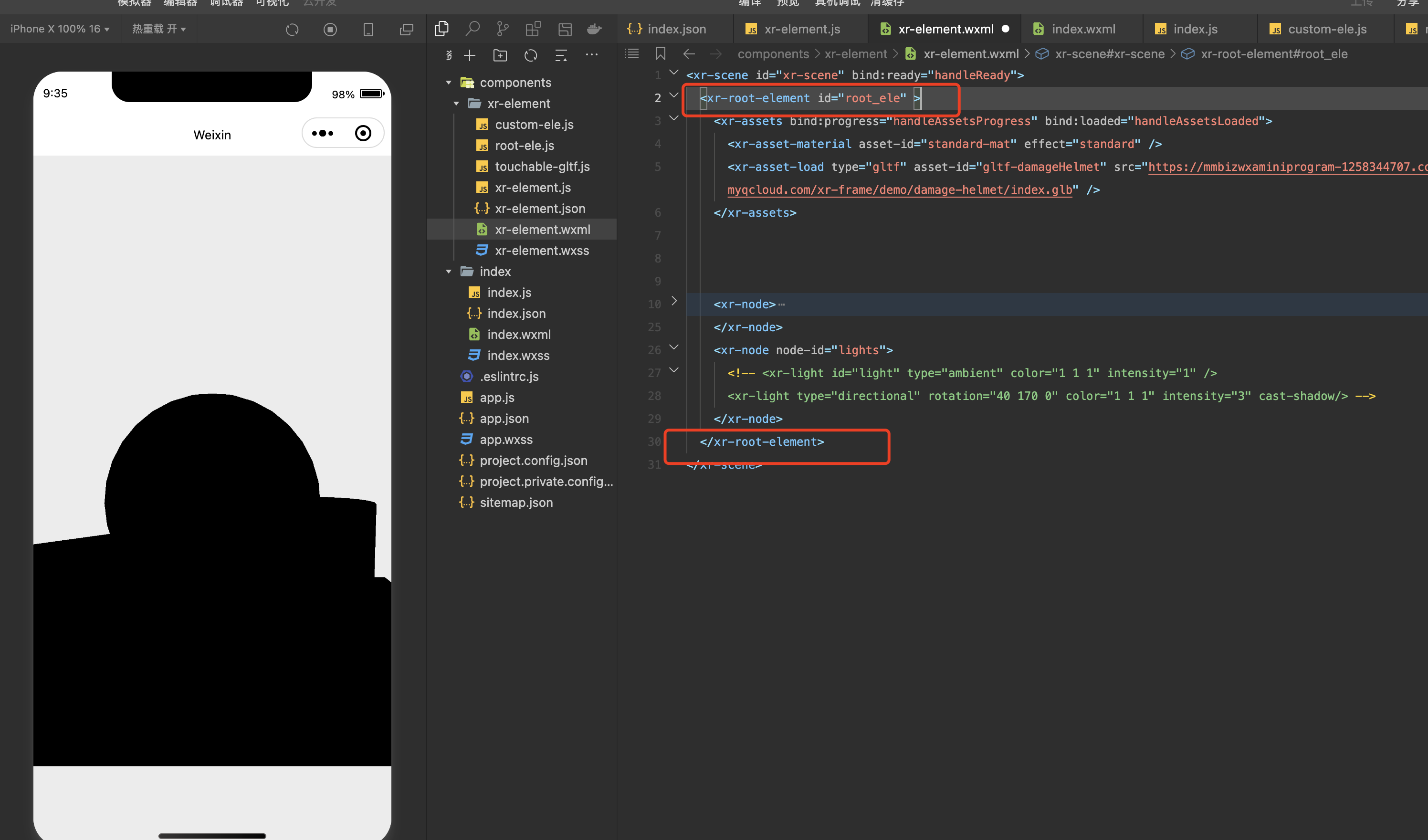 想实现一个在自定义元素里,把灯光,相机等基本元素都集成在自定义根元素里,方便管理,实现一个通用的自定义元素