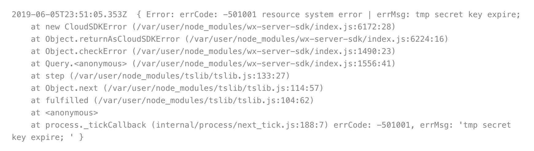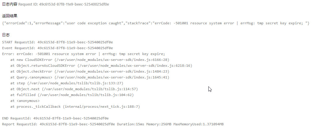 {"errorCode":1,"errorMessage":"user code exception caught","stackTrace":"errCode: -501001 resource system error | errMsg: tmp secret key expire; "}