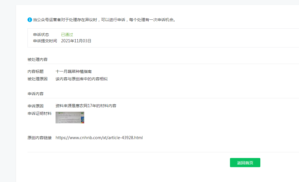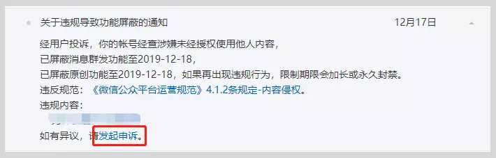 在收到相关处理通知后,如对平台的处理有异议,可前往微信公众平台通知中心找到对应的站内信通知,然后点击发起申诉,申诉需上传真实有效的相关证明材料,如申诉通过,文章和帐号相关功能即可恢复正常。