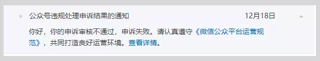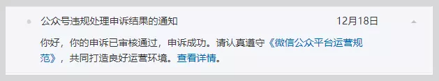 当一篇文章被平台判断为抄袭后,其微信公众平台通知中心将会收到两条处理通知:删文、功能封禁,如有异议,需分别发起申诉。删文申诉成功后,该文会自动恢复。但功能封禁是对帐号层面的处理,想要申诉成功,需在同一时间段内被处理的所有文章都申诉成功,功能封禁才能解封,如果其中一篇文章申诉不成功,功能封禁则无法申诉成功,需等待封禁期限到期自动解封。