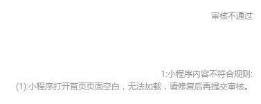 2、APPID:wx88c894282450b2aa,代码体验正常,驳回原因:小程序打开首页页面空白,无法加载。