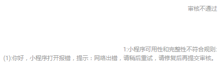 1、APPID:wxde74c4066ac2204b,代码体验正常,驳回原因:打开报错,提示:网络出错,请稍后重试