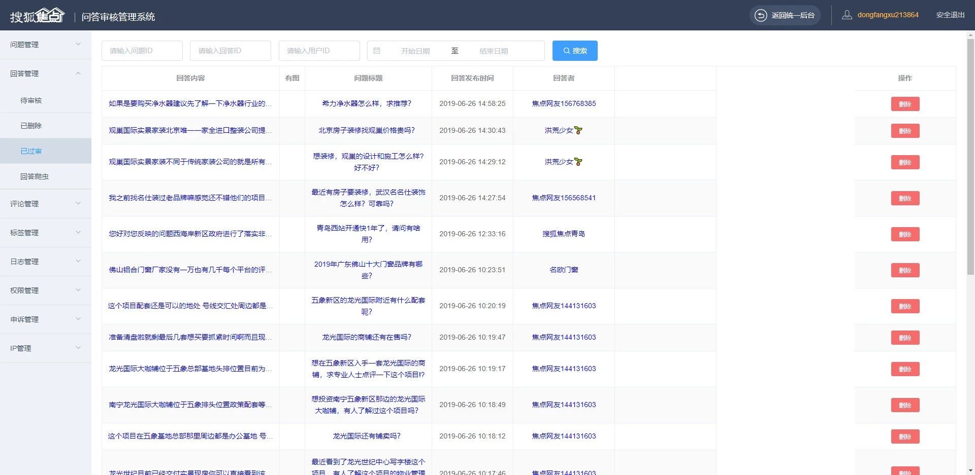 PS:之前提交审核两次不给通过,说是因为内容审核存在风险,我们也直接反馈了,拼房帝小程序内的内容(问答、资讯等)都会经过搜狐集团的机器审核、以及搜狐焦点内部的人工审核,下图为我们公司审核后台截图。