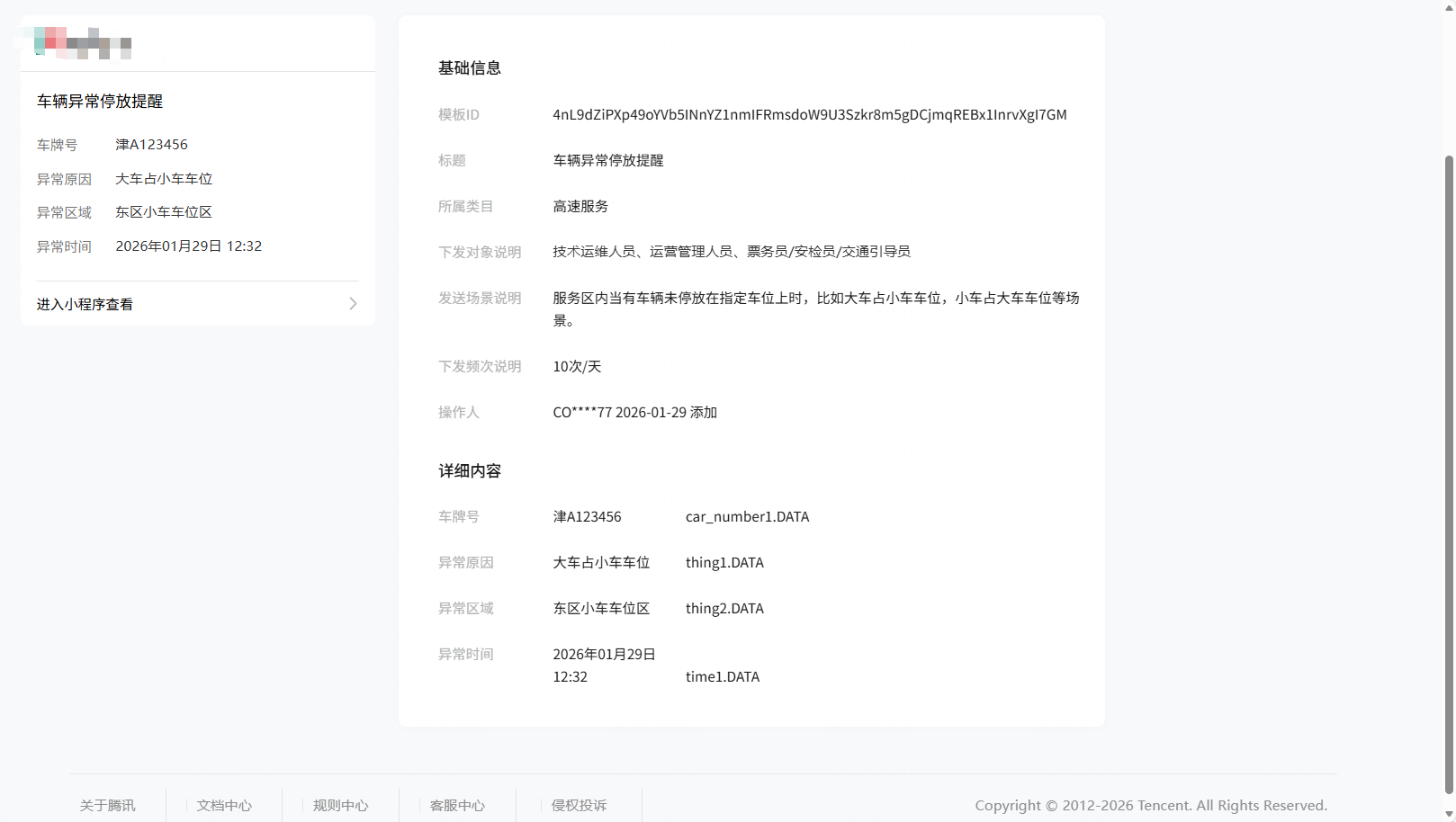 "data" : "{\"car_number1\":{\"value\":\"苏JG585J\"},\"thing1\":{\"value\":\"大车占小车车位\"},\"thing2\":{\"value\":\"东区小车车位区\"},\"time1\":{\"value\":\"2026-02-02 10:34:46\"}}"