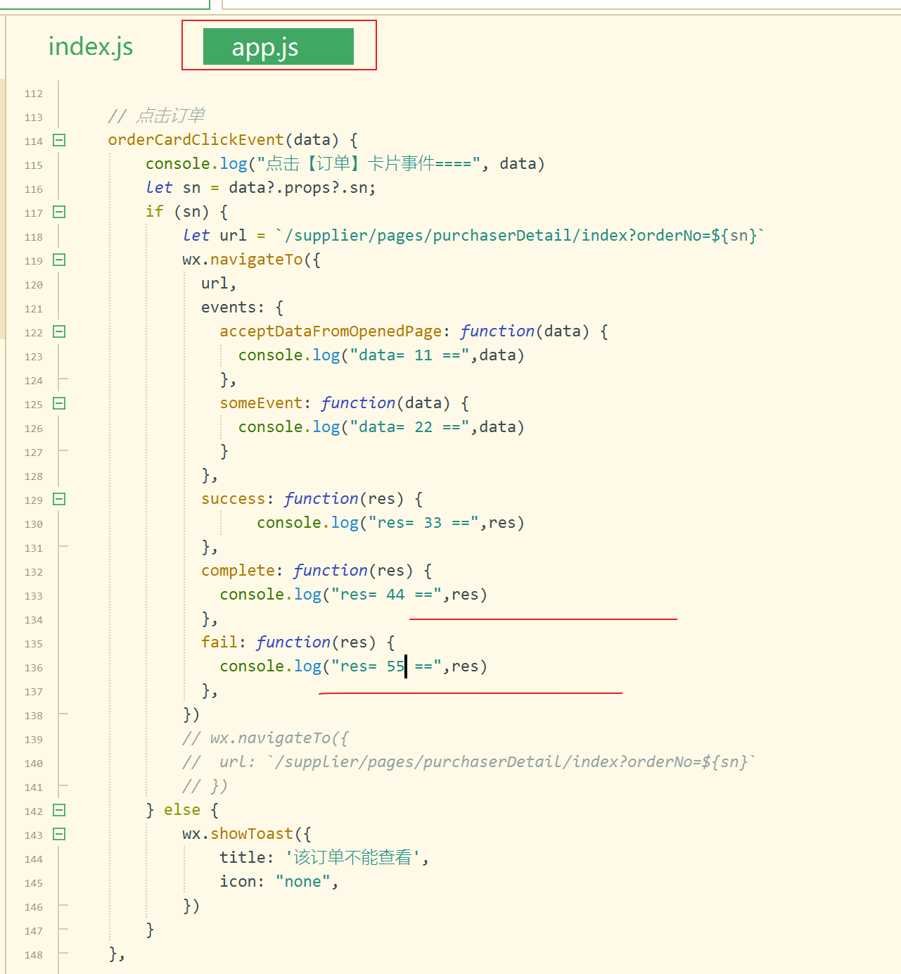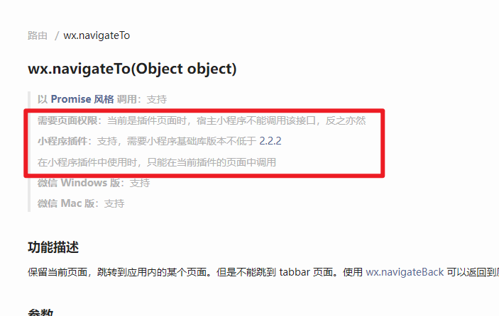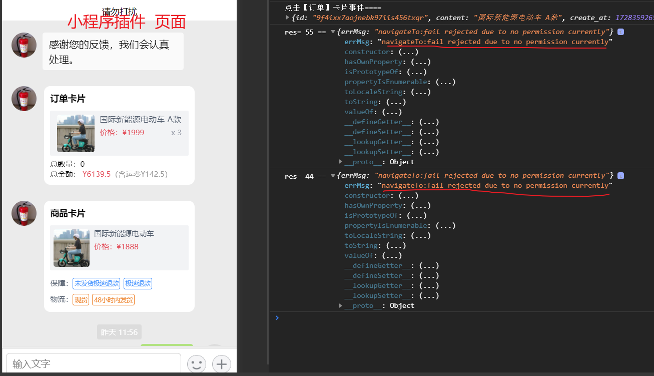 在小程序插件中返回 一个点击事件。如下图:在聊天界面(左图)点击订单卡片,事件在app.js 文件(右图)中接收事件,参数都已经拿到,但是微信开发者工具报错:navigateTo:fail rejected due to no permission currently,无法跳转到对应的页面