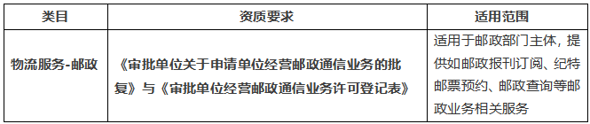 1、【物流服务-邮政】:涉及提供邮政部门主体,提供如邮政报刊订阅、纪特邮票预约、邮政查询等邮政业务相关服务