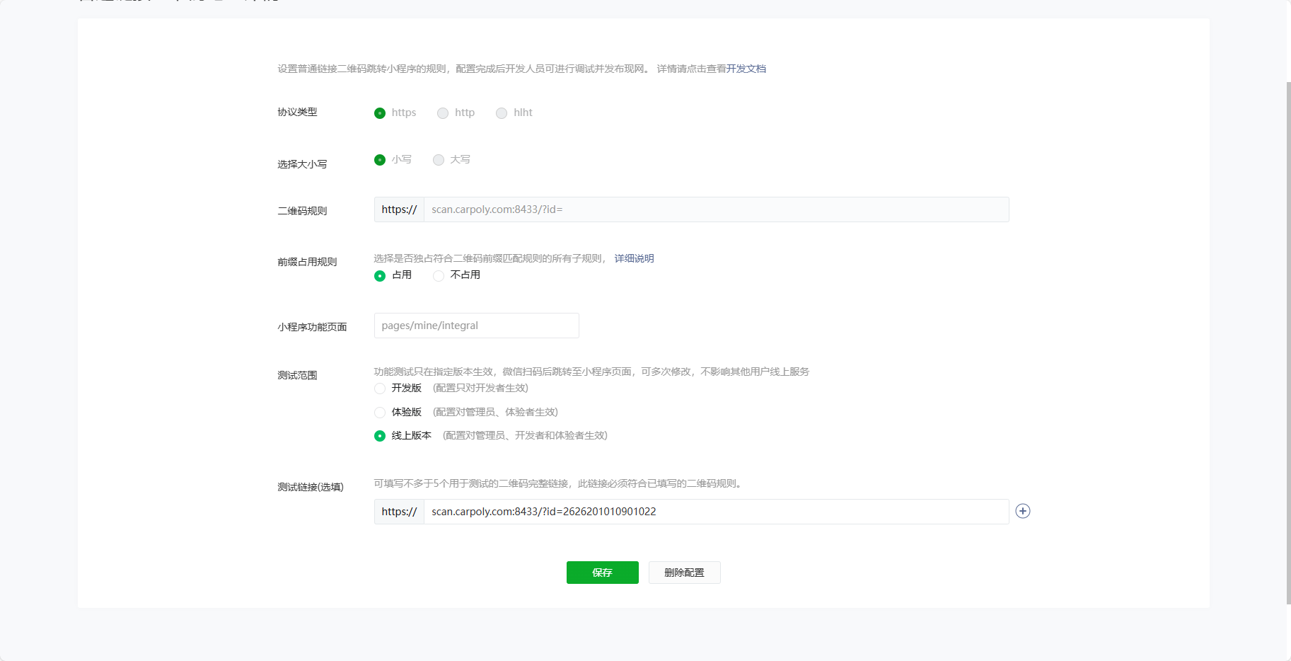 然后在https://a.com 设置了https://a.com?a=1 https://a.com?a=2 这两个测试链接,如果你选择的是“体验版”,那么这两个链接二维码扫描之后 会跳转到体验版。如果你扫描的是https://a.com?a=3 这个链接二维码,那么会跳转到正式版(因为你https://a.com 已经发布,并且没有在测试链接里面)。