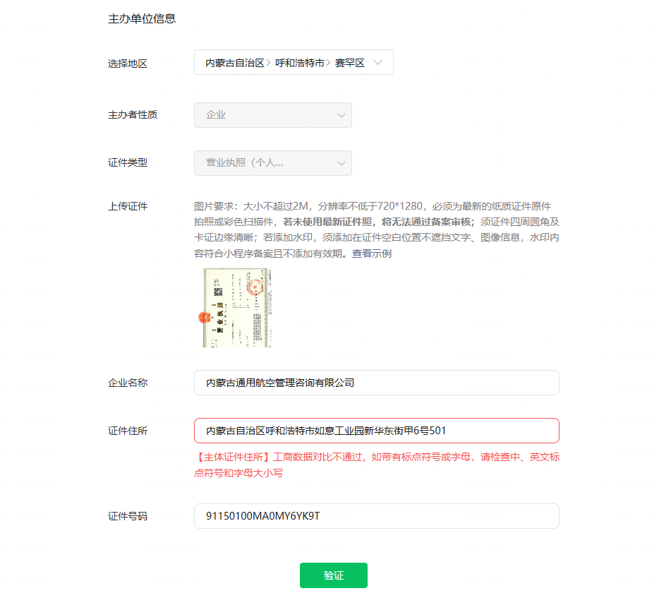 小程序验证备案时,选择地区没有我们营业执照的地区,把现有市区内的旗县区都选择了一遍都显示比对不通过,这种情况怎么解决?