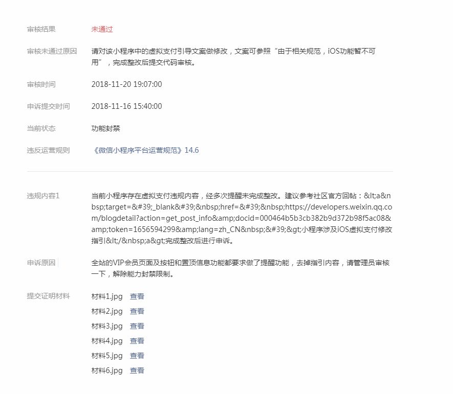 我们公司的小程序之前因为虚拟支付问题被封禁了“IOS用户搜索小程序”的功能。修改后首页申诉未通过,提示“除小游戏类目的安卓内购功能,开发者在iOS系统上提供的虚拟物品不能展现任何购买、支付的功能、页面、按钮,即使实际上它们都不可使用;也不得引导至外部网页或APP来实现支付功能。请对上述内容做修改,完成整改后提交代码审核。”,无法再次申诉。